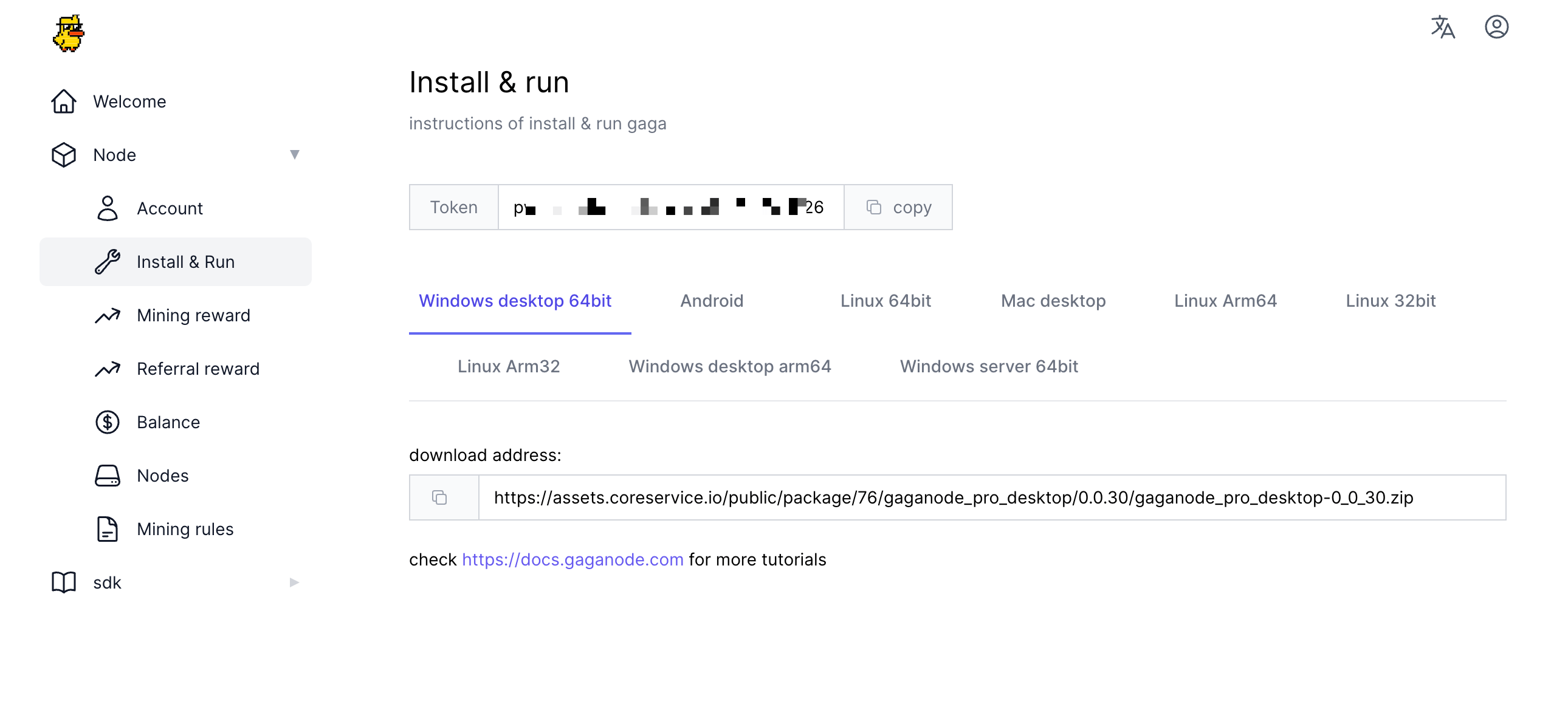 Click the button âInstall & Runâ and you can find out your token and installation tutorial in this page.